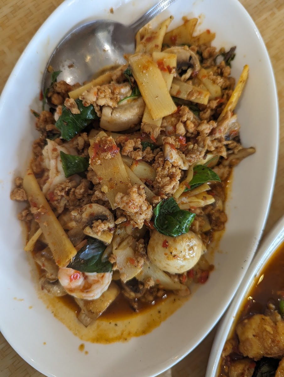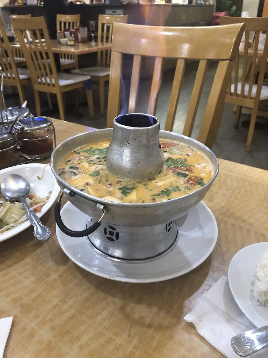 The restaurant’s menu features a variety of dishes that transport your taste buds straight to Thailand. One standout is the Tom Yum Pot, a rich and aromatic soup packed with tangy, spicy, and savory notes. The combination of fresh herbs, lime, lemongrass, and chili creates a tantalizing broth that warms you from the inside out. Paired with succulent shrimp, mushrooms, and herbs, it’s the perfect dish to kickstart your meal.