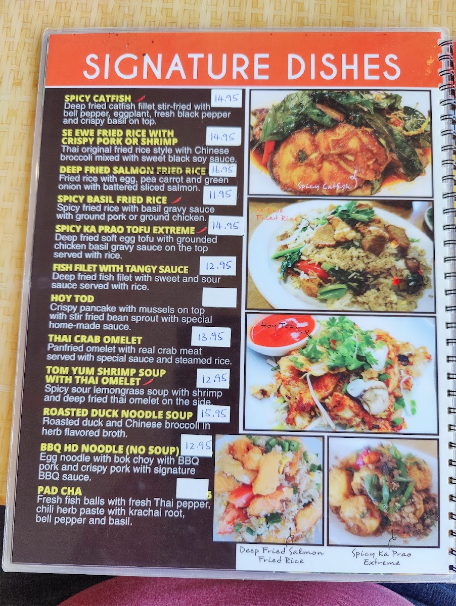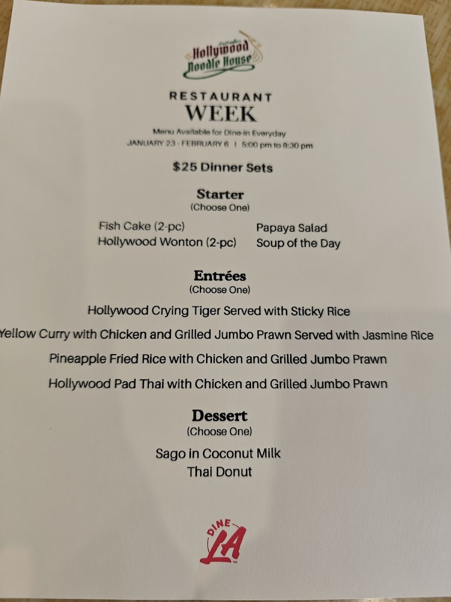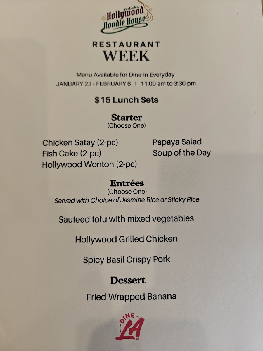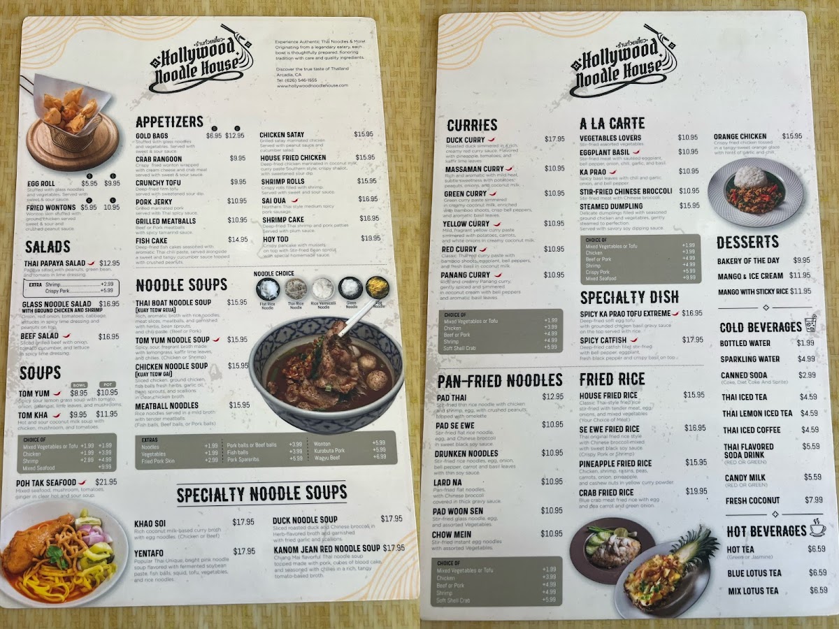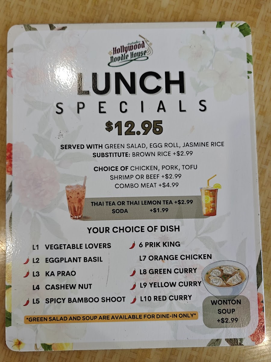 From a reviewer’s perspective, Hollywood Noodle House serves an eclectic and satisfying selection that spans comforting classics and bold Thai flavors. The menu features a variety of tray options like Tray (L) A La Carte, Tray (L) Appetizer, Tray (L) Fried Noodles, Tray (L) Fried Rice, and Tray (L) Specialty that make it easy to sample favorites, alongside refreshing drinks such as Bottled Water, Sparkling Water, Canned Soda, Thai Iced Tea, and Thai Lemon Iced Tea. Rice lovers will appreciate choices like Steamed Rice (S), Steamed Rice (L), Sticky Rice, and Garlic Rice, while the fried rice section delights with House Fried Rice, Se Ewe Fried Rice, Pineapple Fried Rice, Crab Fried Rice, and Sausage Fried Rice. The specialty offerings, including Spicy Ka Prao Tofu Extreme and Spicy Catfish, provide heat and depth, and the à la carte selection ranges from Vegetables Lovers and Eggplant Basil to Ka Prao, Stir-Fried Chinese Broccoli, and Orange Chicken. Noodle enthusiasts can indulge in Pad Thai Hollywood, Pad Se Ewe, Drunken Noodles, Lard Na, Pad Woon Sen, as well as a robust assortment of curries like Duck Curry, Massaman Curry, Green Curry, Yellow Curry, and Red Curry. The noodle soup and soup sections offer comforting bowls such as Thai Boat Noodle Soup, Tom Yum Noodle Soup, Chicken Noodle Soup, Meatball Noodle Soup, Khao Soi, Tom Yum (Bowl), Tom Yum (Pot), Tom Kha (Bowl), Tom Kha (Pot), and Poh Tak Seafood. Salads like Thai Papaya Salad, Glass Noodle Salad With Ground Chicken And Shrimp, and Beef Salad add brightness, while appetizers including Egg Roll (S), Egg Roll (L), Fried Wontons (S), Fried Wontons (L), and Gold Bags (S) make great starters. Desserts such as Bakery Of The Day, Thai Coconut Ice Cream, and Mango With Sticky Rice round out the menu, with a kid-friendly section offering Mini Egg Fried Rice, Mini Noodle Soup, and Mini Stir Fried Noodle With Egg, plus lunch specials like L/Green Curry, L/Yellow Curry, L/Red Curry, L/Cashew Nut, and L/Eggplant Basil for affordable midday options.
